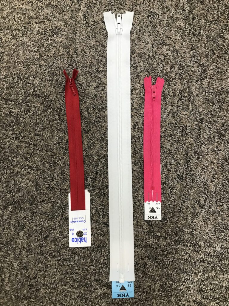 Concealed zips are used in dressmaking or posh cushions and are identified by the slim line teardrop zipper pull. Sometimes called an invisible zip, they give a very elegant finish to a garment as there are no visible lines of stitching attaching the zip to the garment. This is the red one in the photo. Note they can only be inserted correctly with a specialist concealed zipper foot – which don’t come as standard supply with most machines. We do of course have these in The Sewing Shed for students to try.